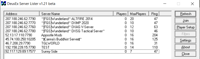 We have 2 ways of seeing what servers are up. One is http://master.333networks.com/s/deusex, and another is via a discord bot that we have in the DXHQ discord server. Both work very well for seeing servers. But, for now... master.333networks.com shows the wrong flag for servers, but i can tell you, 333networks has mades fixes to their geoip software that they use to check the flag of servers. That is poised to release very soon. For now, i'd recommend that if you have a discord account, join us on https://discord.gg/JtnB6MCnQU (DXHQ discord, main hub for DX players) and then stay there, use the bot whenever needed. You will see some familiar faces in that discord, like reclaimer, duke, nobody, cozmo.