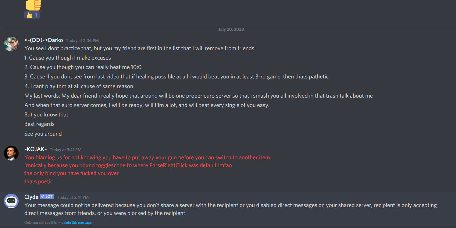 He claimed before a match that he did beat me undercover 10:0, and I said please try to do it. Not only he could not beat me 5:0, not even 3:0, he also had first kill on first match when I still didnt had sniper in hands. He laughed that I make excuse when I said that discord lagging me (he normally cut that part), but you can ask Donny, about that. He already had 3:0. Without that that game would not end hot it did, cause I started to play better, and I played for same way all 3 rounds. Where is problem? Problem was that he lied he can beat me 10:0, and based on those lies I deleted him from Discord. Never respected liars.